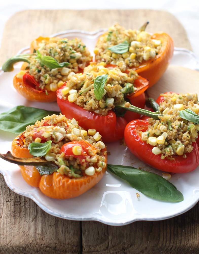 For my pepper stuffing, I pair the freekeh with a quartet of late-summer friends – corn, zucchini, tomato and basil – as well as a little feta cheese. To ensure a tasty filling, you need to carefully season the freekeh’s cooking liquid and work to rid the veggies and herbs of excess water before combining them. Also, be sure to taste and adjust the filling’s seasonings before stuffing the peppers.