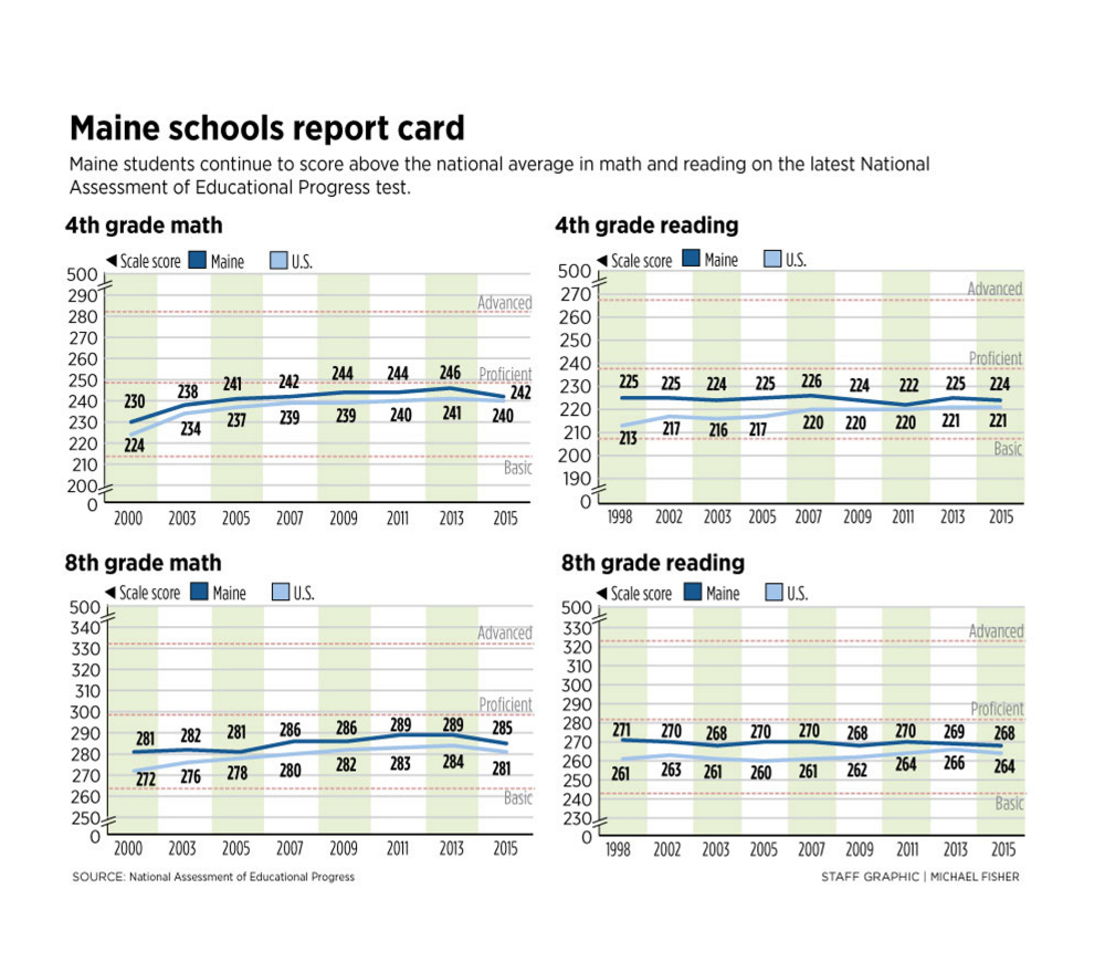 Also Tuesday, Maine business leaders working to improve education released their third annual report tracking the state’s progress on 10 key education benchmarks, including the state’s NAEP scores.
