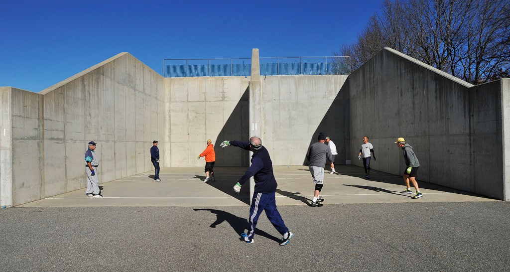 The same core of a dozen men has repeated this cycle for the past decade, since one of them, a retired engineer from Saco named Jim Prendergast, led the drive to build the outdoor handball courts, the only such three-wall structure in northern New England.