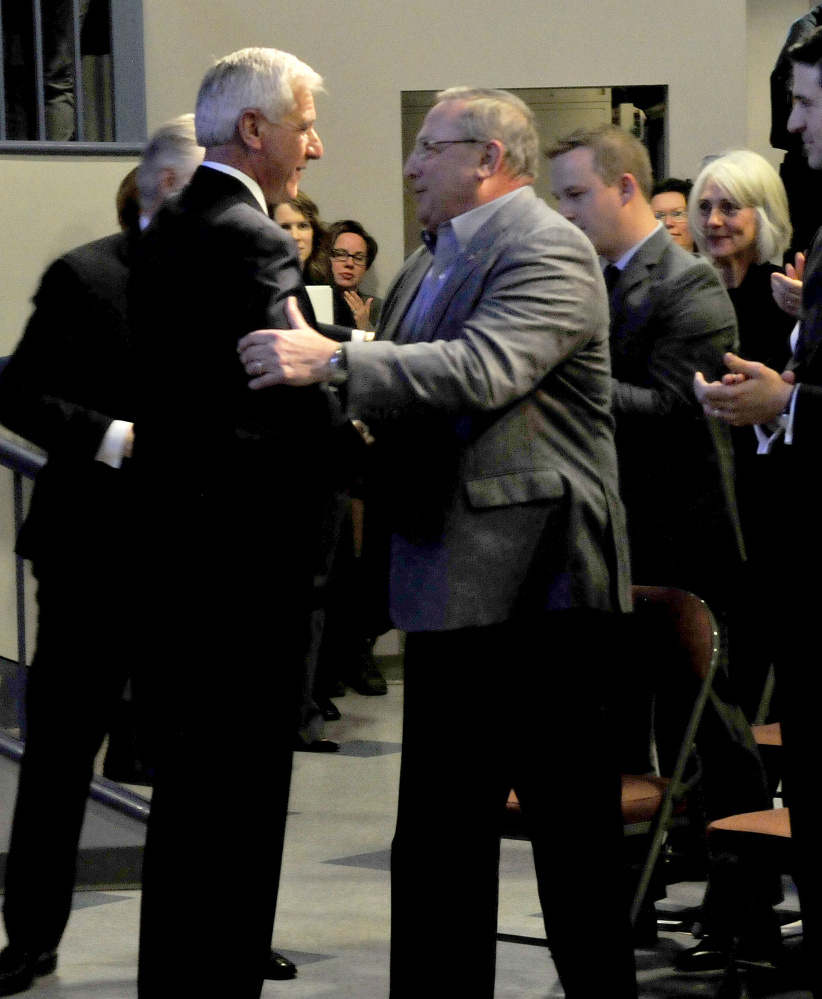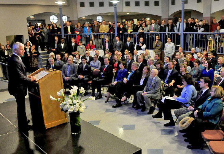 About 300 state and local officials, as well as business leaders and Colby students and staff members, attended Wednesday’s conference, held at Page Commons in Cotter Union. Colby President David Greene, Waterville Mayor Nick Isgro and Robichaud also spoke. Also at the news conference were Greg Powell, CEO of the Alfond Foundation, and Laurie LaChance, president of Thomas College.