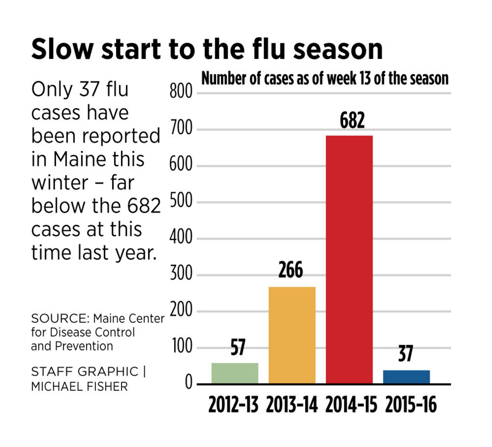Only 37 people in Maine had tested positive for influenza through Jan. 2, according to the Maine Center for Disease Control and Prevention, but Maine is known to have flu outbreaks through April and the number of reported cases varies widely from year to year. There were 4,233 cases confirmed by testing in 2014-15, 2,029 in 2013-14 and only 167 cases in 2012-13. The Maine CDC collects data from October through May. Not all flu cases are reported, so actual numbers each year were likely higher.