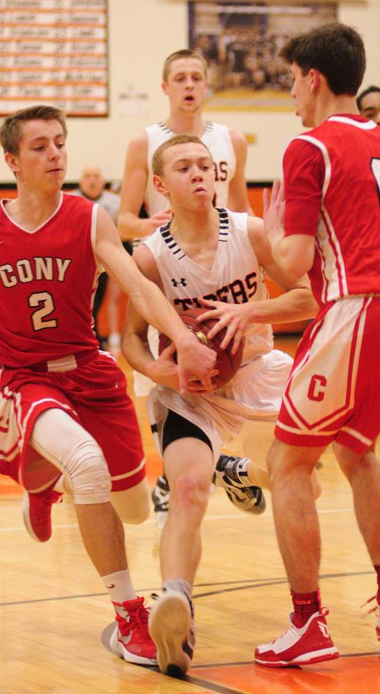 The Tigers took a timeout and set up for the last shot, an Eli Fish 3-pointer from the right corner that was long. The bounce of the rim caromed to the other side of the court, where the ball went off a Gardiner player in the rebounding action in front of the Gardiner bench. Cony’s subsequent inbounds pass was deflected, but the buzzer sounded in the scrum to recover the loose ball.