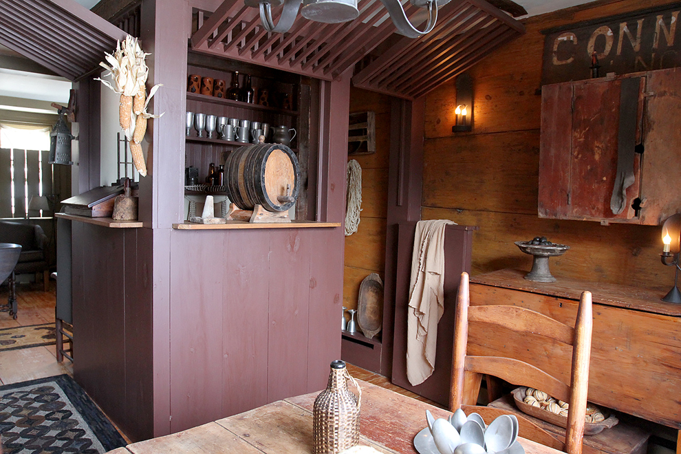 Similar ingenuity appears in the hand stenciling, and the custom baseboards, crafted of wood; and the cool “cage bar” in the dining section of the great room, where drop-downs can enclose the serving hatch, to protect the server. (The home is said to have once been a tavern, after all.)
