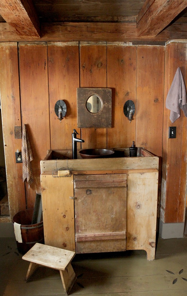 The “make-do” mindset – as in, make use of whatever materials are ready to hand, as our ancestors did – is seen in touches such as the spoke-wheel light fixture and the small mirror and surround (originally a child-size one-seater) in the more rough-hewn of the upstairs baths, whose soaking tub is enclosed behind a broad-boarded shed door.
