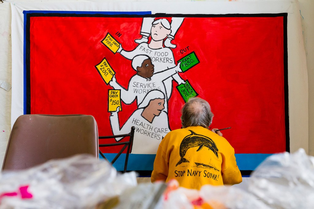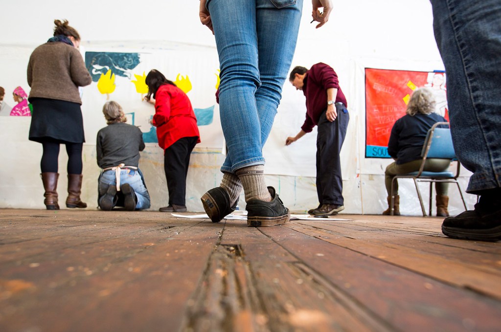 Of course, there’s nothing new about the idea of people engaging in activism through art. For Chisholm, the ability to connect to that tradition, one that he believes is seeing a revival, keeps him coming back to ARRT gatherings. The regularity of those gatherings and the discipline the artists bring to the task – an agenda for the monthly meeting is set and shared with the group about a week in advance – partly define this group. Then there’s the practice of taking requests from activist groups.