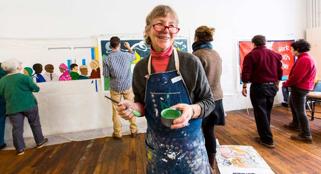 The banners represent the latest effort of the Artists Rapid Response Team. The activist artists from Maine gather monthly to make art for progressive nonprofits across the state and, increasingly, around the country. In four years, the group has made close to 200 banners for use at demonstrations, rallies, fairs and other community events to articulate an image or message.