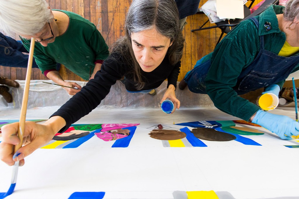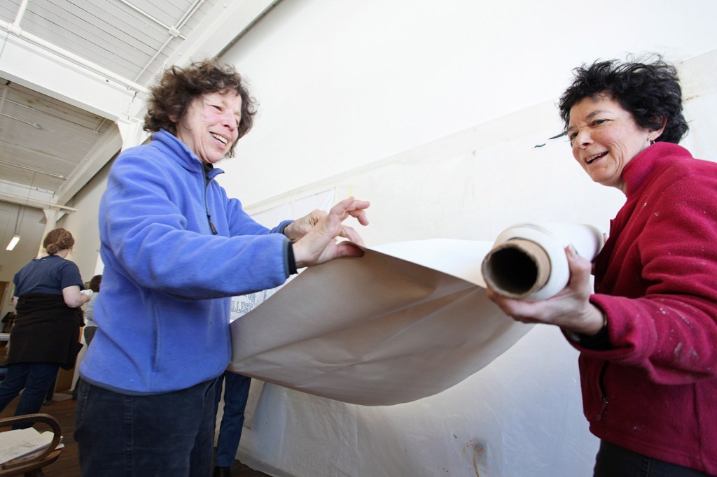 BRUNSWICK — On a cold February morning, a dozen artists sit around a large work table in a light-filled studio at Fort Andross Mill. Thermoses of tea and coffee, a plate of blueberry bread and a box of doughnuts are passed around, along with sketches of banners the artists have gathered to create.