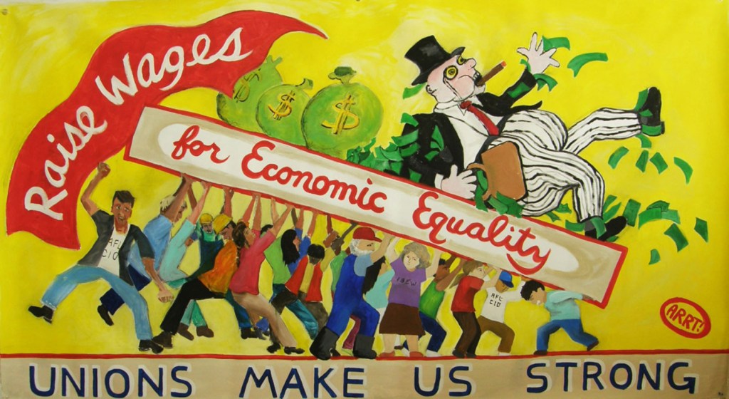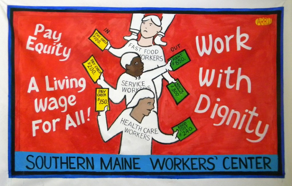 A project of the Union of Maine Visual Artists, ARRT meets at a private, spacious and sun-filled studio at Fort Andross in Brunswick. They take requests from activist organizations around Maine that are preparing for rallies or protests and want banners to help spread their message.