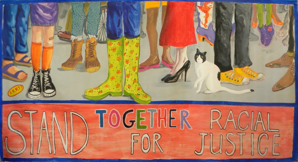As Greenhut talks, she stands alongside a quartet of artists, each with a brush in hand as they work on one of the banners for Central Maine Showing Up for Racial Justice. It’s a dramatic work of art, showing a dozen people – and one very cute cat – from waist down wearing colorful footwear: black sneakers, yellow boots, brown Bean boots, blue sandals. Below them are the words “Stand Together for Racial Justice” painted in large letters.