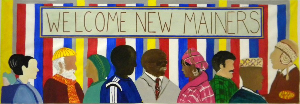 Four banners made by the group are hanging at the Holocaust and Human Rights Center of Maine in Augusta as part of the exhibition “Yearning To Breathe Free: The Immigrant Experience in Maine,” which opened Thursday and runs through April 1.