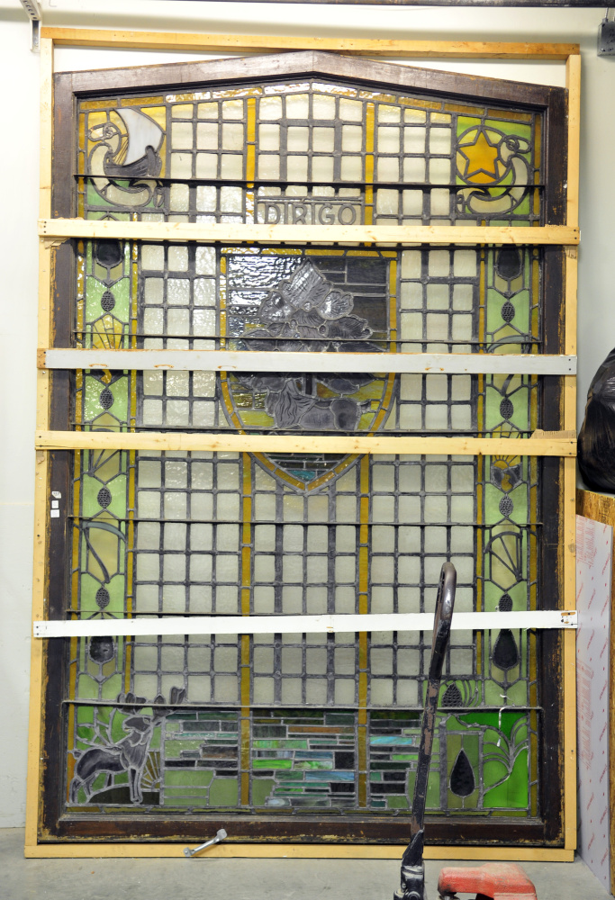 The Plymouth Trading House image was worn completely from the medallion of that window. Pohl said she has done and continues to do research to try to find a sketch of the trading house so it can be recreated on the window before it is returned to the library.