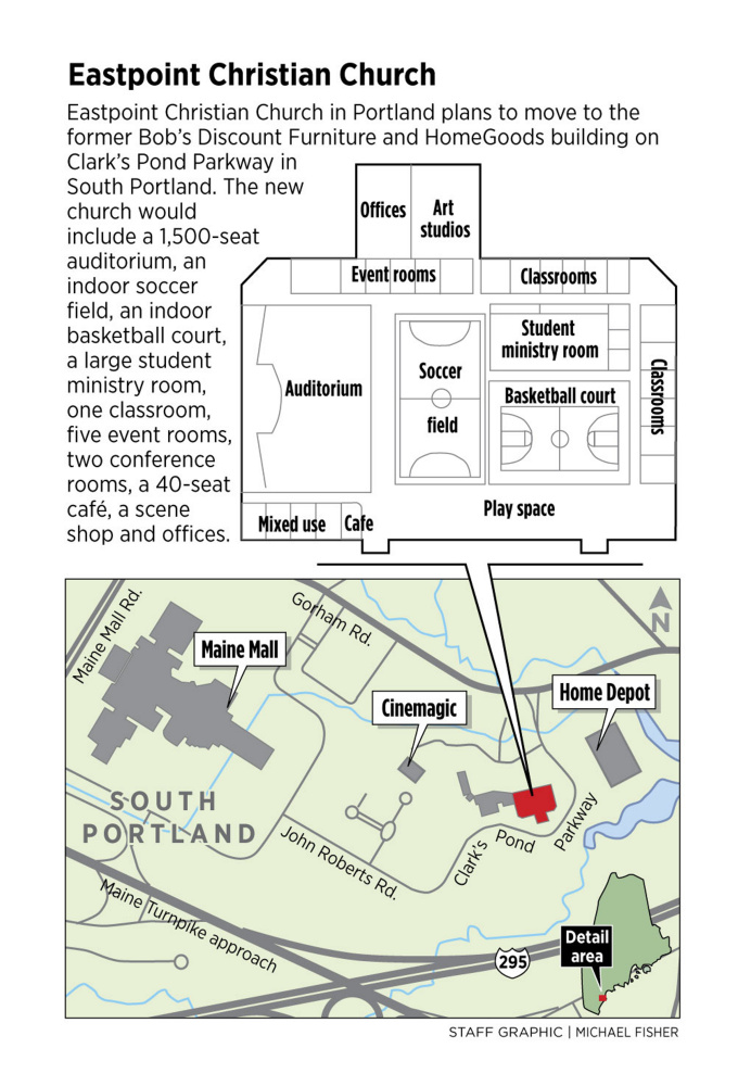 SOUTH PORTLAND — The fast-growing Eastpoint Christian Church in Portland plans to move into two vacant big-box stores in a shopping plaza near the Maine Mall.