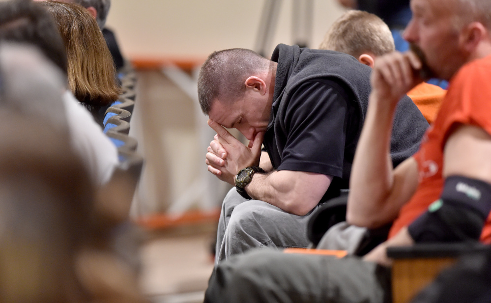 Audience members listen to Gov. Paul LePage on Tuesday during a town hall-style event at Madison Area Junior High School in Madison.