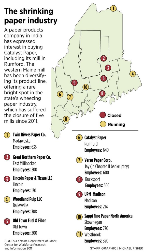 Catalyst bought the Rumford mill, which makes coated paper, from NewPage Holdings in January of 2015 for $62.4 million. It employs 640 people, according to mill officials.