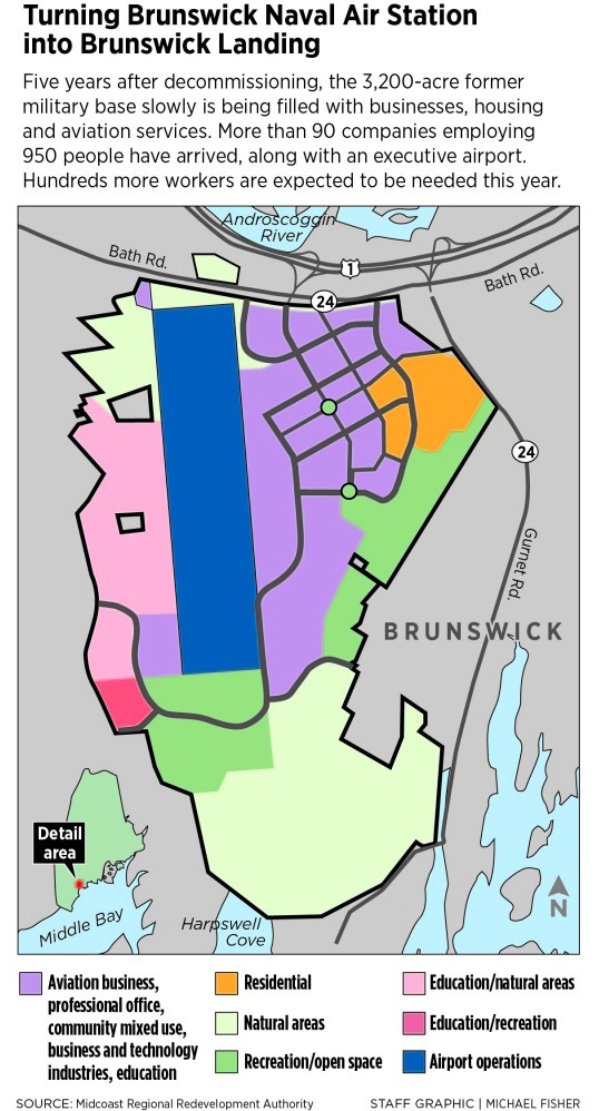 At this pace, Brunswick Landing can remain ahead of projections, said Steve Levesque, a former state economic development director. Levesque came here soon after the closure was first announced and now serves as executive director of the Midcoast Regional Redevelopment Authority, which is overseeing the transformation.