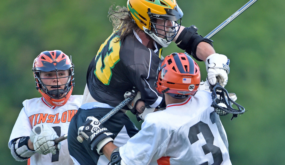 WATERVILLE — As storm clouds threatened in the distance, both the Maranacook/Winthrop and Winslow boys lacrosse teams looked to weather some early struggles Tuesday afternoon at Thomas College’s Smith Field.