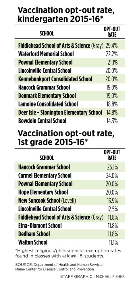 A few schools reported 20 percent or more unvaccinated kindergartners or first-graders, including elementary schools in Pownal, Hancock and the Fiddlehead School of Arts and Science, a public charter school in Gray.