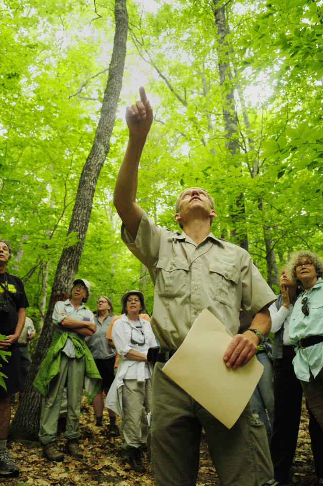 Biologist Eric Hoar, the ground manager for the project, led the 45-minute walk through the forest, stopping at three different spots to illustrate what kind of work would be done and why the work was necessary. Several trees were marked with an X, which means they were to be saved, while others were marked for removal.