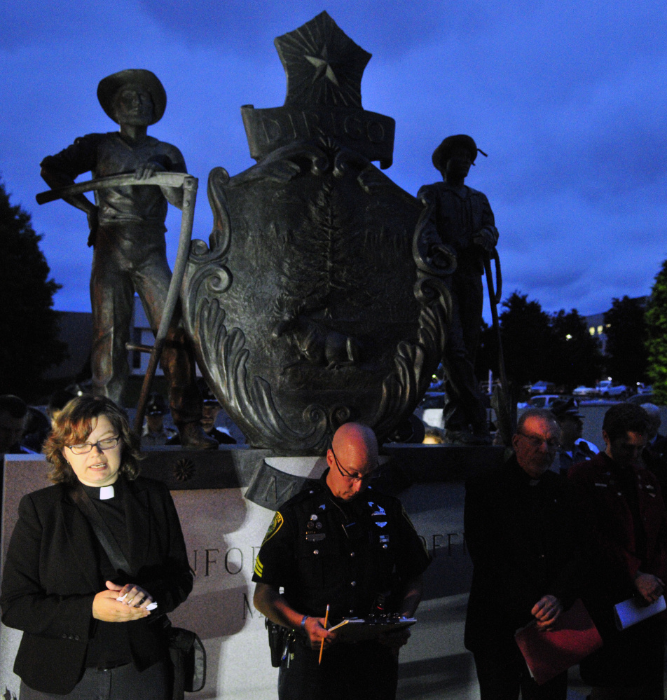 Kate Braestrup, chaplain for the Maine Warden Service was among the speakers to offer comments and comfort to those gathered. She said she had met two of the officers who were shot, one who was killed and one who was injured, when she attended a conference in Dallas last year.