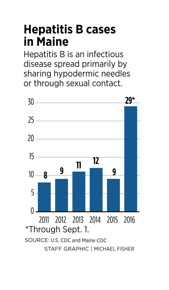Through Sept. 1, the Maine Center for Disease Control and Prevention reported 29 cases of acute hepatitis B, more than twice as many as the dozen cases that occurred in 2014. In a typical year, Maine would have fewer than 10 hepatitis B cases.