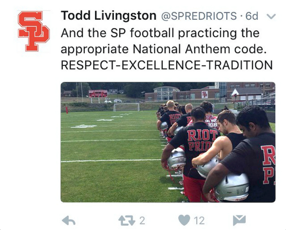 The third tweet showed a photograph of the South Portland High School football team, heads bowed and helmets held at their hips, “practicing the appropriate national anthem code.” The tweet also referenced the department’s core covenants of respect, excellence and tradition, which all coaches are emphasizing.