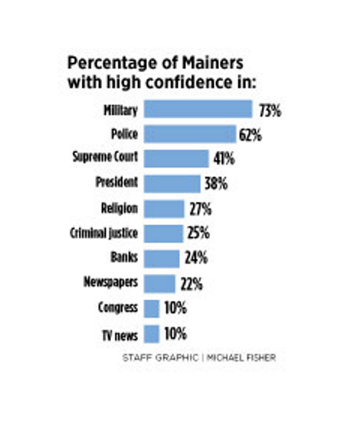 Mainers have little confidence in most major institutions, including Congress, the presidency, organized religion, the criminal justice system, banks and the news media, but they do have faith – relatively speaking – in police and the military.