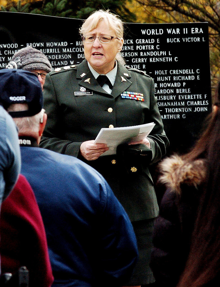 Retired U.S. Army Major Susan Horsman, now a certified registered nurse anesthetist and member of the local Elks Lodge, asked the audience to think back to the past. She talked about what it means to see names from the Civil War and World Wars on the memorial.