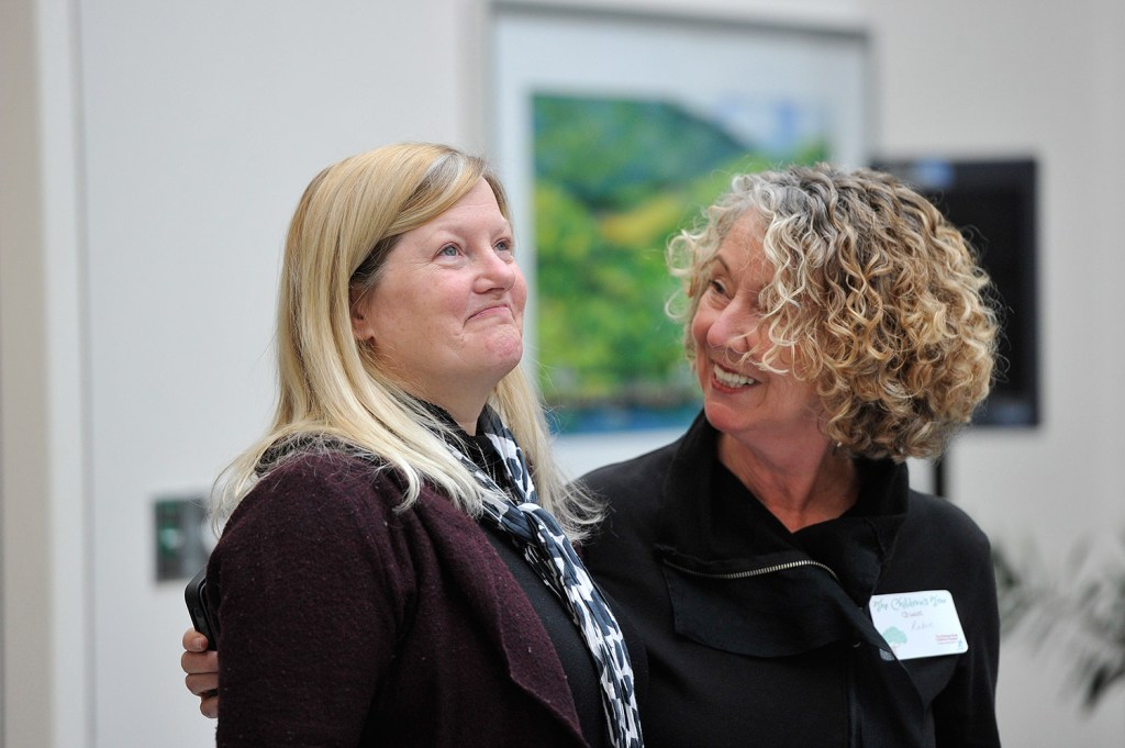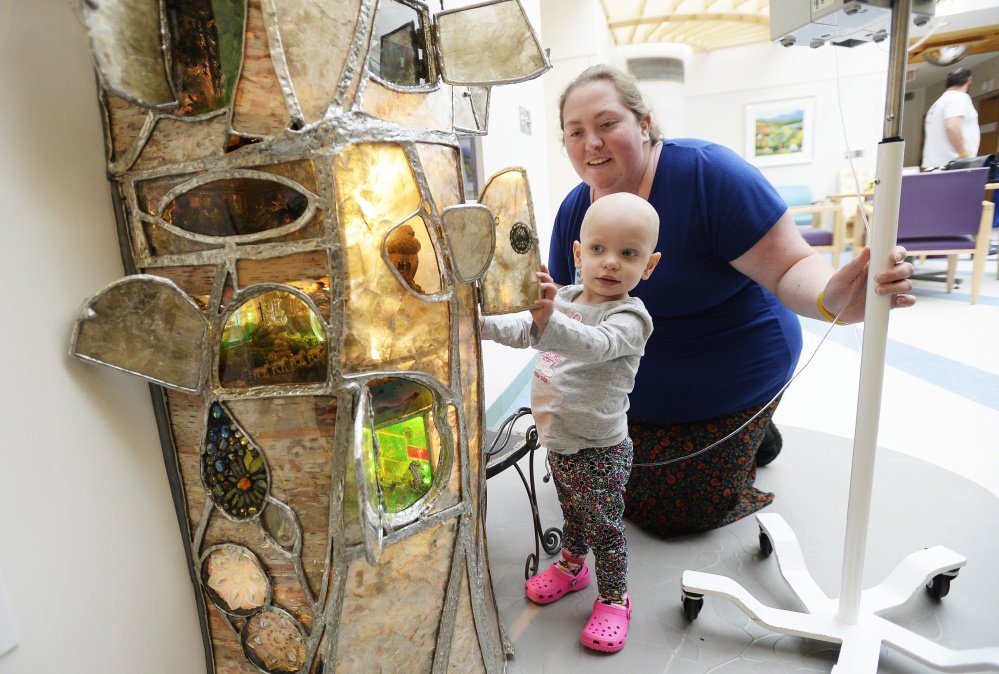 An anonymous donor paid for the tree sculpture installed along a wall in the atrium of the sixth floor. Constructed with a glass-like polycarbonate and mica, the tree sparkles and fills the room with light. Little doors on the tree’s trunk open to reveal mysteries and gem-like wonders within. Fuller calls them “doors to a different world. It’s hard when you’re in here. You forget how to play. You miss being outside.”