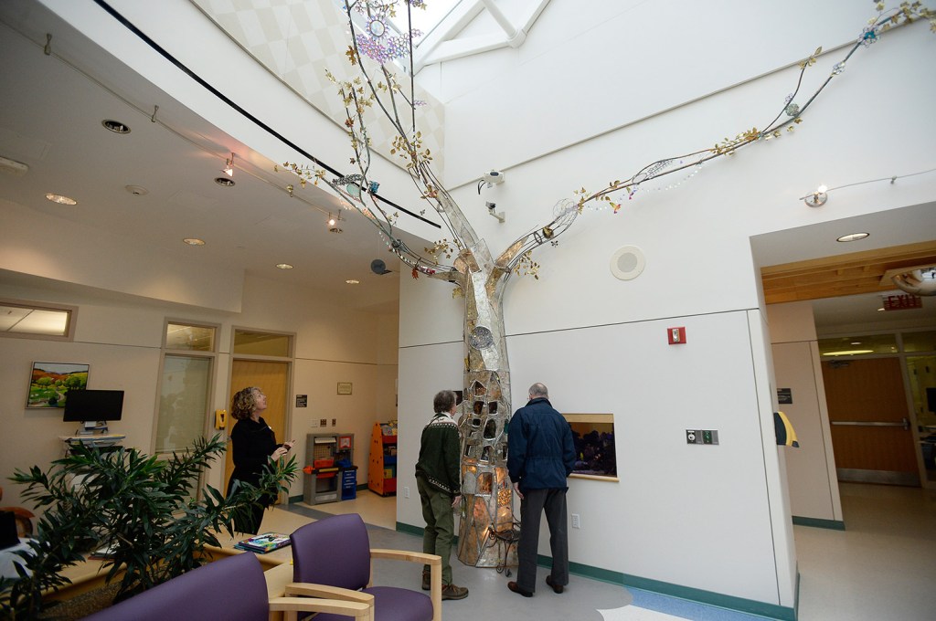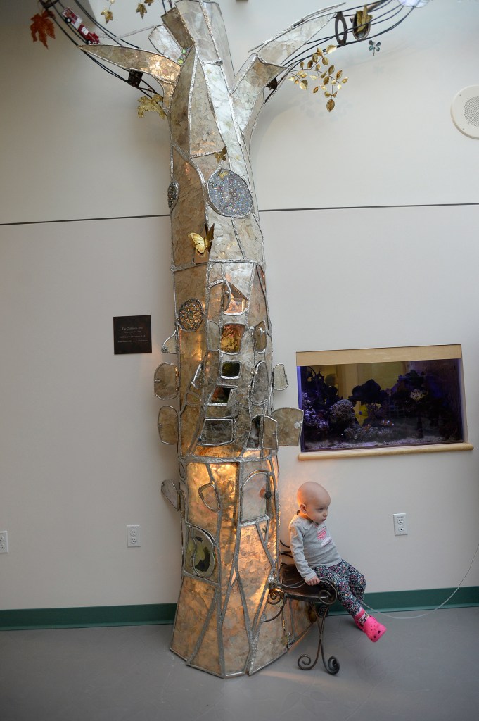 Dr. Lorraine McElwain, director of inpatient pediatrics, said the tree has brightened the atmosphere. It changes with the light and the time of day. Sometimes it shines. Other times it glows. It always catches people’s eye, McElwain said.