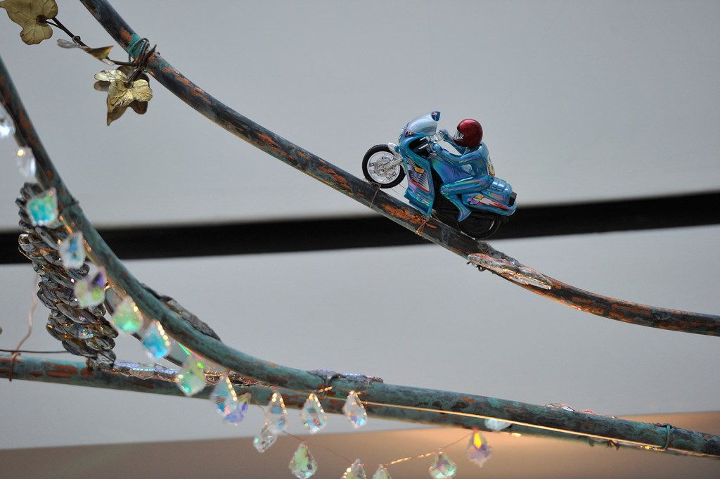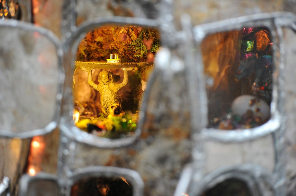 In her studio practice, Fuller creates three-dimensional stained-glass art that has panels embedded with natural objects. The tree sculpture does too, on a larger scale. Fuller hid 95 treasures within the tree, behind the doors and along the branches that reach out across the walls and the room’s arched ceiling. There are beetles, polar bears, hummingbirds, elephants, little motorcycles, baseballs and two lucky blue feathers.