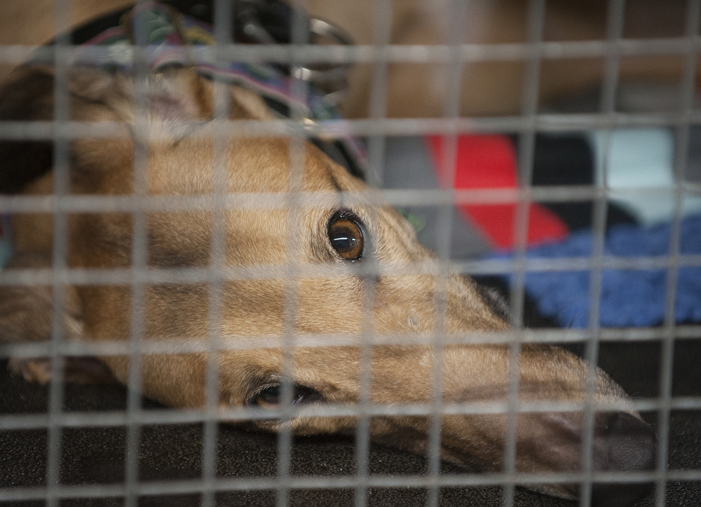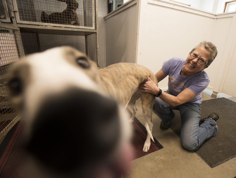Four years old and with a reddish-blond coat, Gwen is one of 11 greyhounds that recently were brought to the Maine Greyhound Placement Service, a nonprofit organization in Augusta that takes in the speedy pooches and gets them ready for adoption by people around the state.