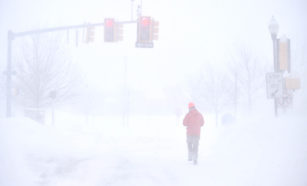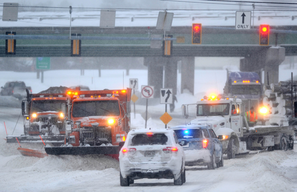 Local and state police urged people to stay off the roads unless absolutely necessary on Monday, and most seemed to heed that call. Even so, Maine State Police were still busy, saying a Facebook post that dozens of vehicles had gone off the road “and even plow trucks and cruisers are getting stuck.”