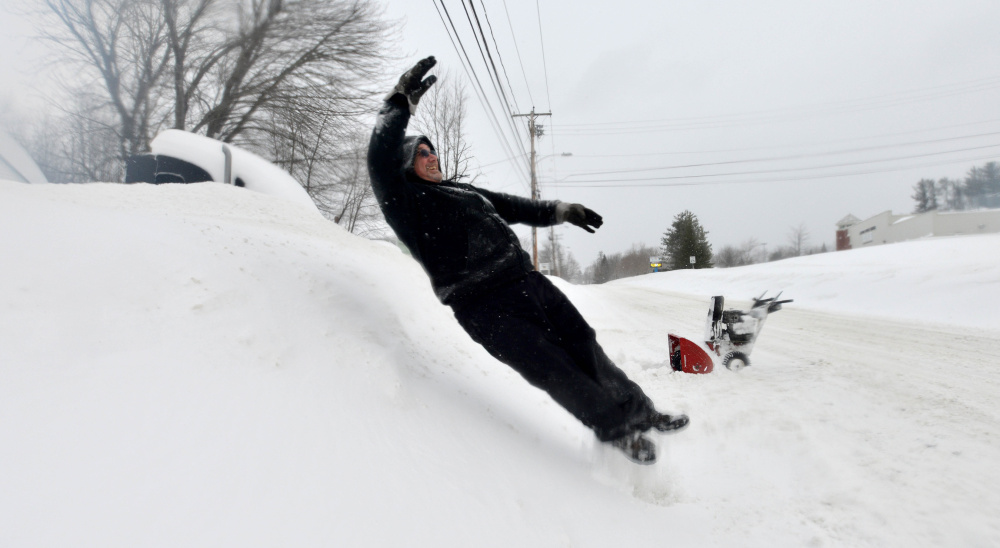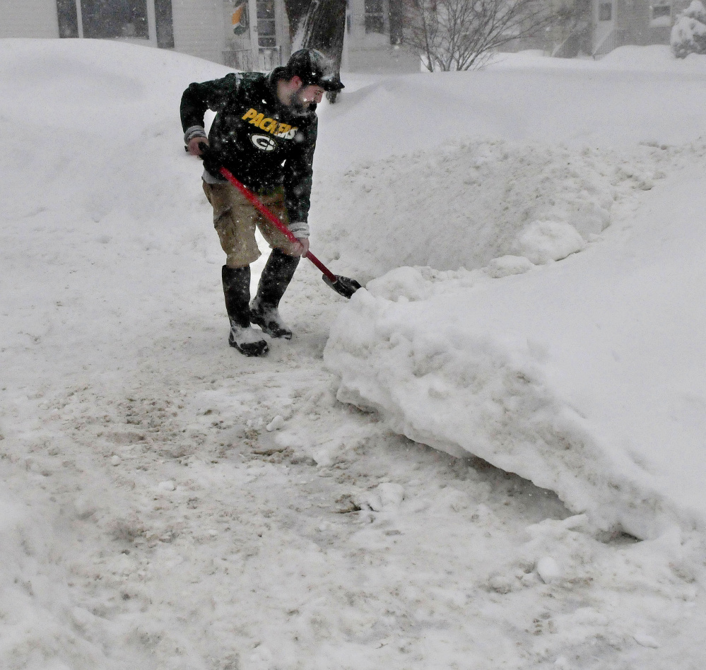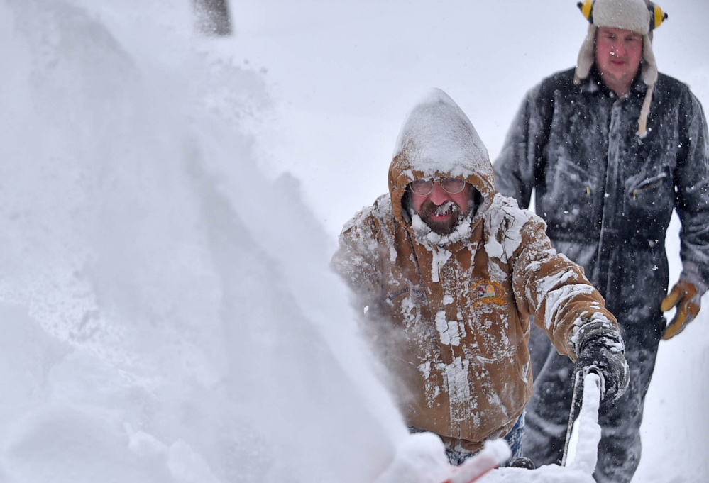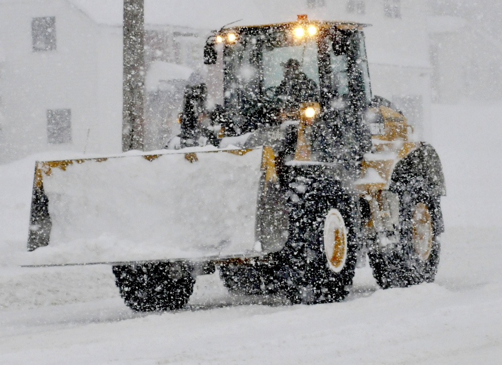 In Skowhegan, Road Commissioner Greg Dore said he measured 15 inches outside the town garage Monday morning as heavy snow continued to fall. He expected another 8-10 inches before it all wound down.