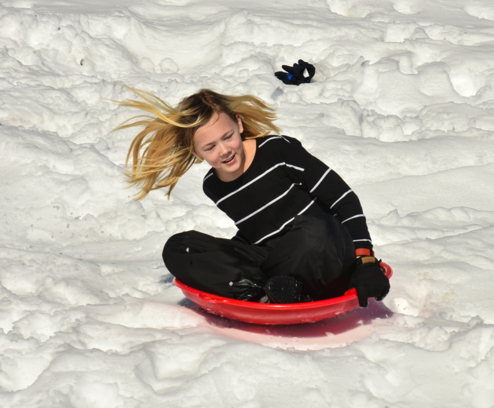 Other city police and the fire department came out for the event as well. Officer Brad Chase scooted down a hill on a saucer, practicing for the anticipated sled- with-an-officer event.