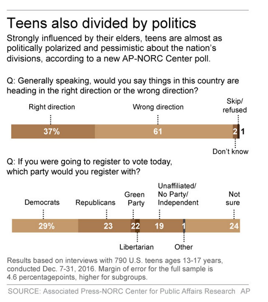 Now, a new survey of children ages 13 to 17 conducted by The Associated Press-NORC Center for Public Affairs Research with the permission of their parents finds that America’s teens are almost as politically disillusioned and pessimistic about the nation’s divisions as their parents. The difference? They aren’t quite as quick to write off the future.