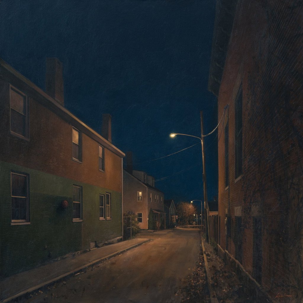 His niche is nighttime paintings. The quality of light becomes Frederick’s central subject. It might be an undersized street lamp, outmatched by engulfing dark, or a single light emanating from an otherwise darkened apartment building. He never puts people in his paintings, though their presence is suggested – by the taillights of their cars and the blue light of TVs seeping from homes into the quiet night. Comparisons to American realist Edward Hopper come easily.
