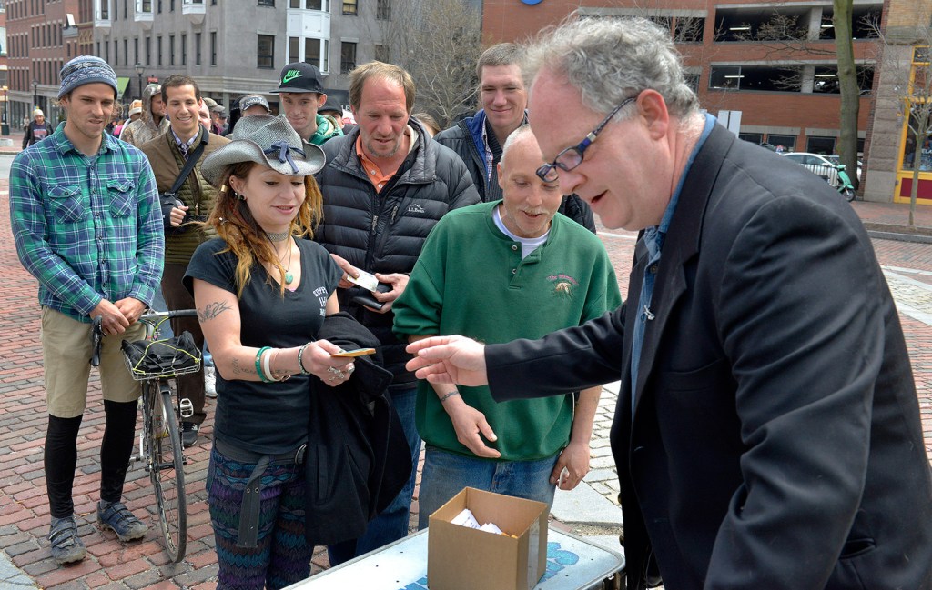 The local writer and marijuana entrepreneur gave out small envelopes of pot after announcing the giveaway on social media. The line formed immediately at noon and was about 100 people deep throughout most of the lunch hour. Each person received a single gram of a marijuana strain called Blueberry Euphoria. Barry estimated that he handed out about 225 grams of pot within an hour.