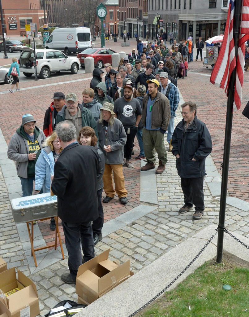 Nick Hasenfus, 22, of Portland, heard about the giveaway from his girlfriend. He came to Monument Square with his two roommates to see it for himself.