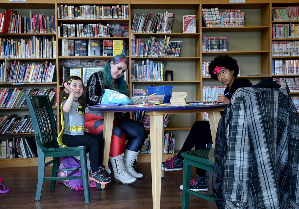 Young and old, boys and girls, and moms and dads mingled in the Bartlett Room for Teens, some in costume, some composing their own comic characters, some making superhero masks, all for the good cause of reading and getting together for some fun, said Sarah Taylor, teen services director at the library.