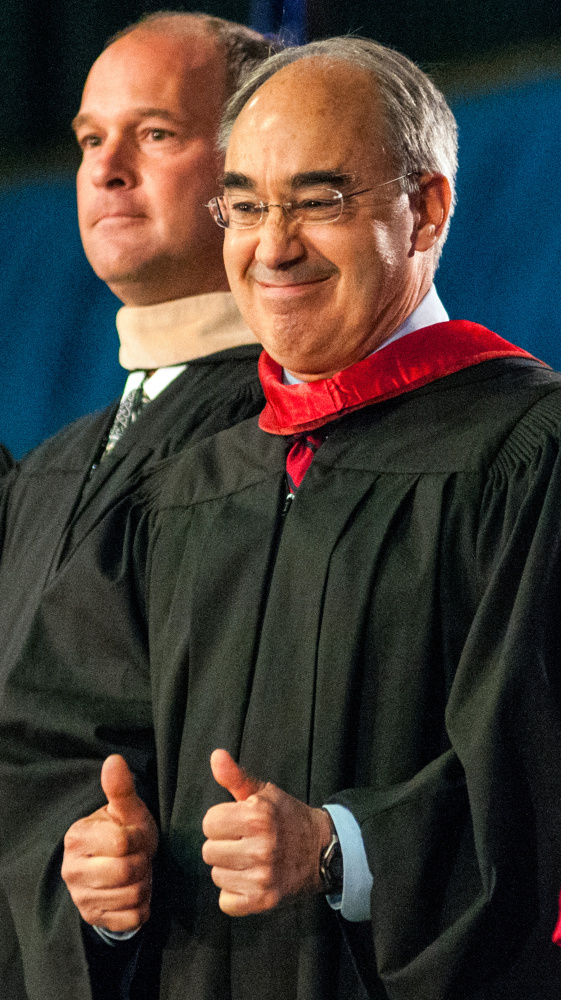 Hopper offered that piece of wisdom on Saturday morning, as students from the college got ready to receive their diplomas in a packed Augusta Civic Center. He held up a flat, metal plate that he had purchased from Aubuchon Hardware in Augusta and that masons use to hold the mortar they’re working with — the inspiration for the name of the flat caps that many college graduates wear.