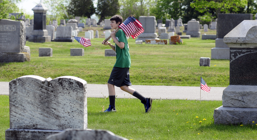 The Legion post coordinates the flag placement through the city. Maine law says, “Each municipality, as directed by its municipal officers, annually shall decorate on the day Memorial Day is observed the graves of veterans of the Armed Forces of the United States of America with an American flag and appropriate flag holders.”