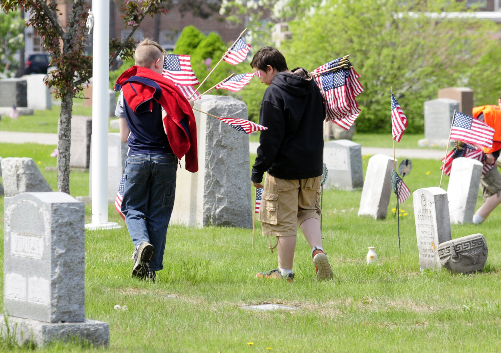 AUGUSTA — Many hands — more than 60 pairs of them — made short work of placing American flags at veterans’ graves Wednesday at the city’s Mount Hope Cemetery atop Winthrop Street.