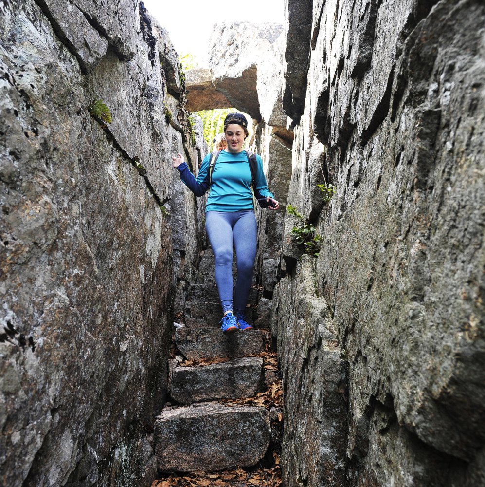 It leads 30 yards into the woods before the primitive steps appear. From there the path rises another 338 steps along boulders and through natural stone archways to panoramic views of treetops and, eventually, Frenchman’s Bay. The stone steps hug and blend into the mountainside, but on purpose.