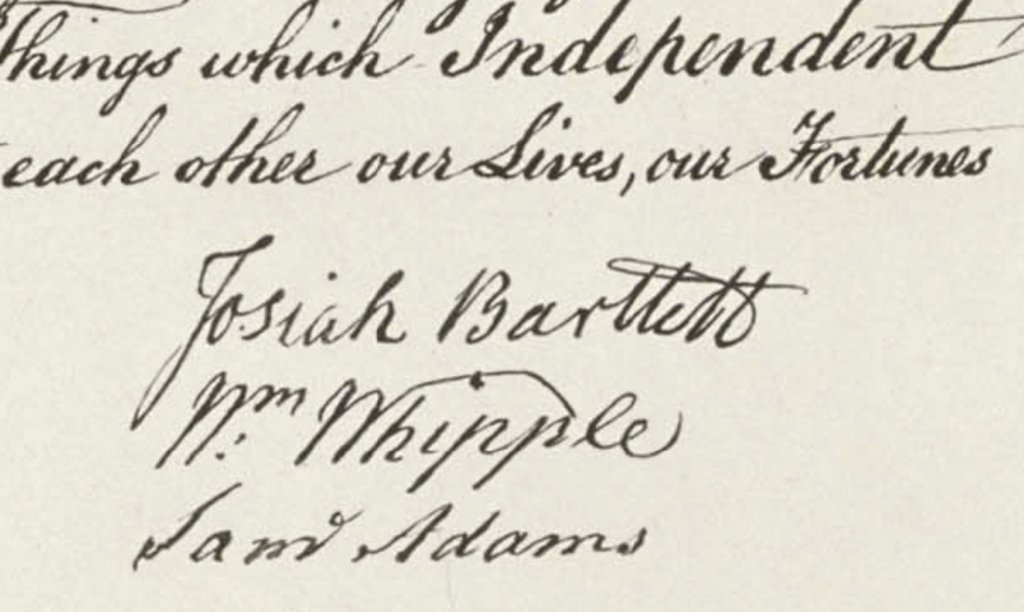 Whipple voted for independence on July 2, the Declaration of Independence on July 4, and signed the declaration on Aug. 2. His signature sits between Bartlett’s and those of famous Massachusetts patriots Sam Adams and John Adams.