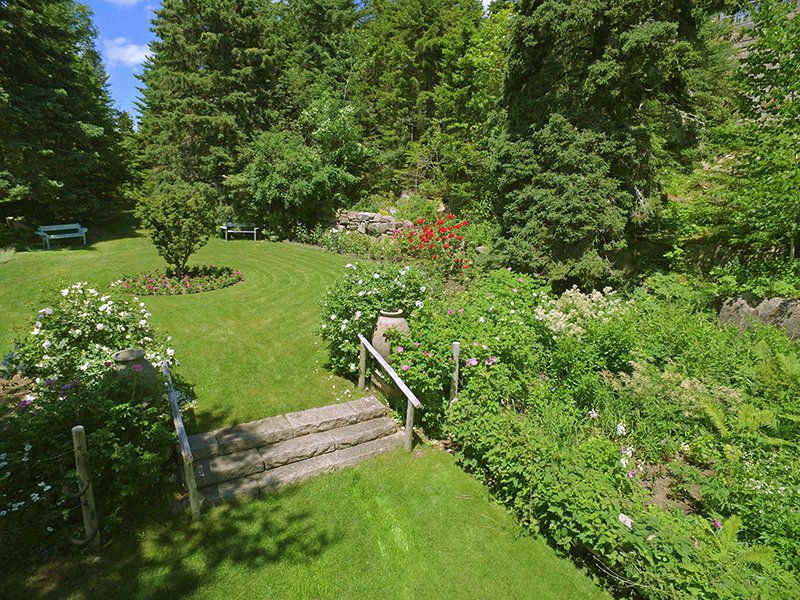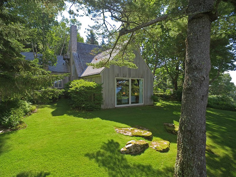 The property has wide grassy trails, much like the carriage roads of Acadia, and includes rolling lawns and gardens, forest, a granite walking path with a railing along the cliff, and a large rock in the midst of the forest that serves as a meditation spot. The estate has a granite swimming pool, guest cottage, two-car garage and flower gardens, including a circular rose garden.