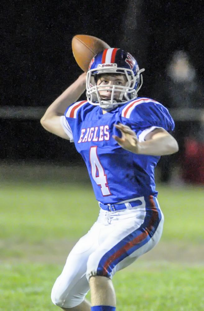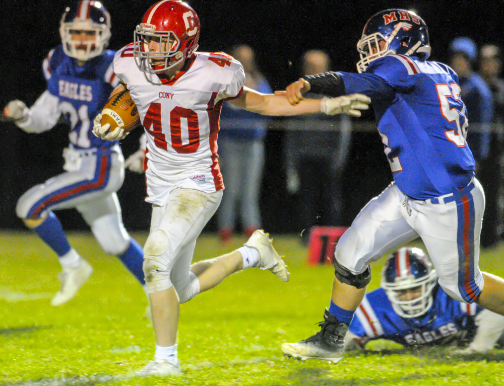 The Cony defense didn’t buckle, however, limiting one of Class B North’s highest-scoring offenses to a 30-yard Kyle Burger-Roy field goal with 3:16 left in the third quarter to make it 21-17. The next two drives, despite each starting at the Messalonskee 45-yard line, resulted in punt attempts, and the snap for the second one sailed over Burger-Roy’s head and allowed Cony to take over at the Eagles 9.