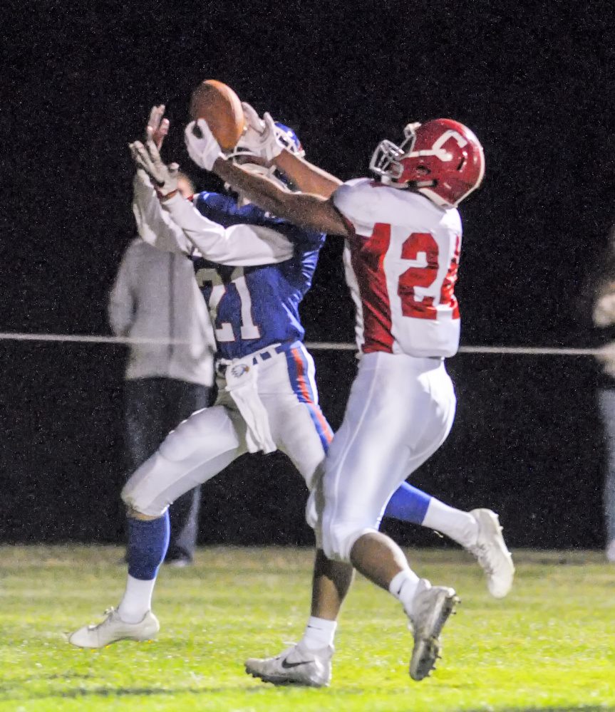 The fireworks weren’t finished. Sousa teamed up with Dutil (five catches, 79 yards) on Cony’s last drive of the half, hitting him first for 22 yards to the Messalonskee 34 and then, after an offensive penalty, for 17 on a comeback route to the Eagles 22. A screen pass to Logan Leadbetter brought the ball to the 15, and Sousa then found Dutil on the same comeback route, with the senior wideout turning and diving over the pylon for a 21-14 lead with only 31 seconds to go in the half.