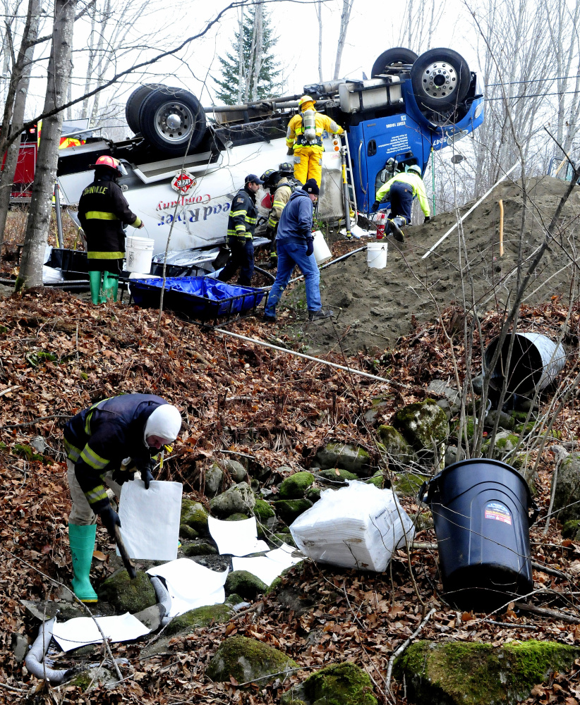 The accident — about half way between Athens village and the Skowhegan town line — resulted in about 1,000 gallons of No. 2 heating oil being spilled onto the ground near a small stream, said Jon Woodard, an oil and hazardous materials specialist from the Maine Department of Environmental Protection.