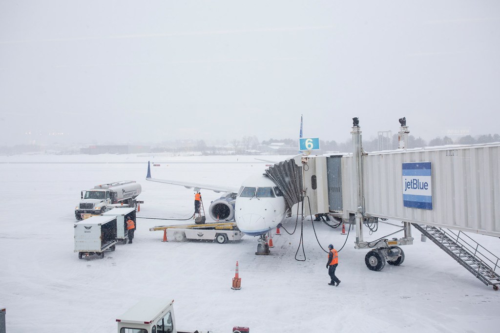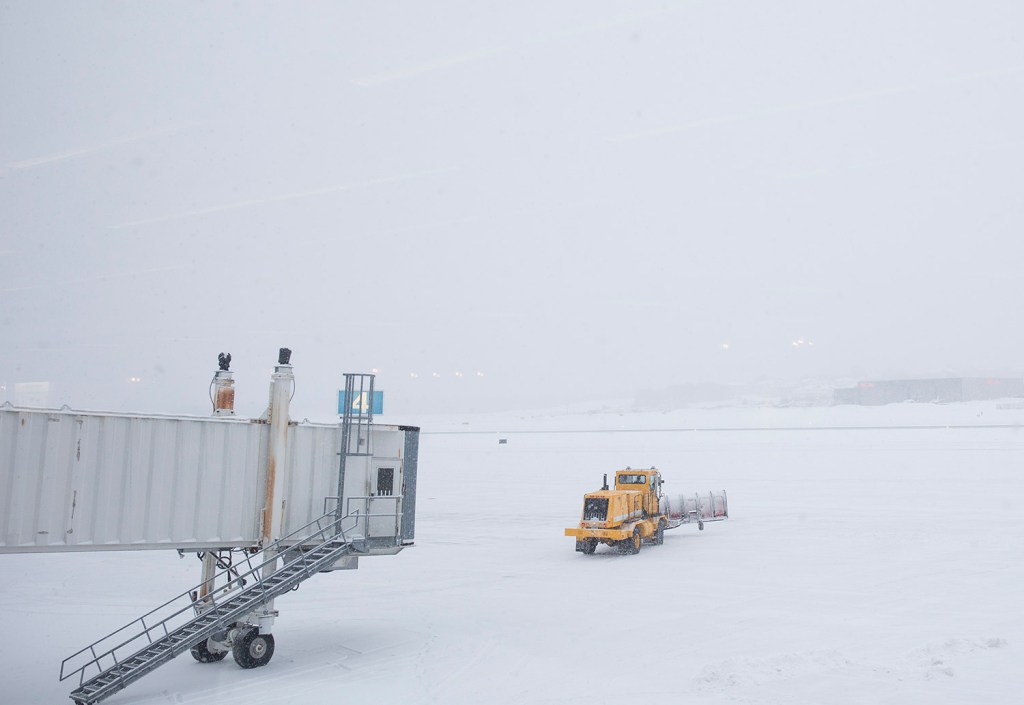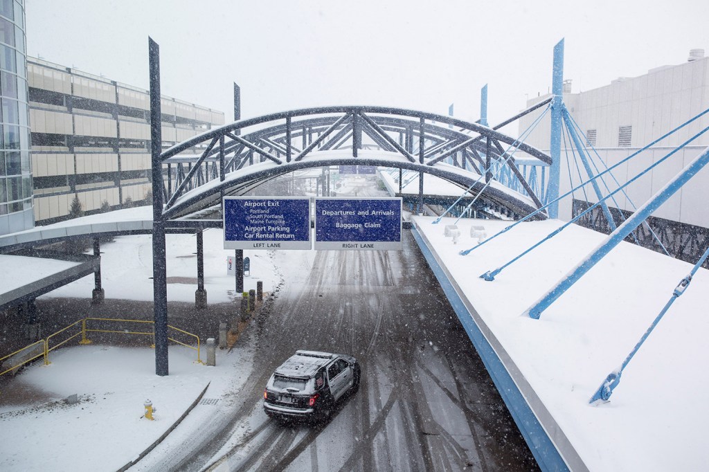 At Portland International Jetport, plows were out on the runways throughout the day. Four American Airlines flights from Philadelphia were canceled, but most flights were arriving and departing on time with only minimal delays. Several flights early Saturday already had been canceled by late Friday afternoon, all of them American, and at least one delay was already listed.