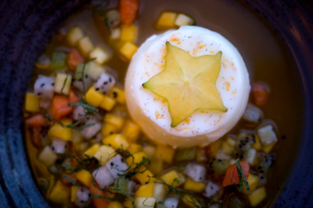 The tropical-themed panna cotta at Salt Pine Social in Bath, an homage to Krista Kern Desjarlais’ dearly missed Bresca.